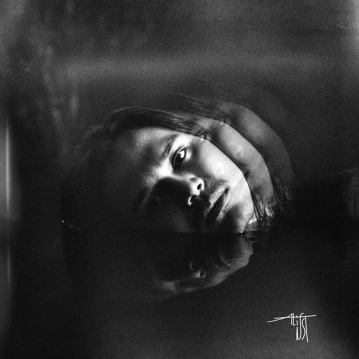 Artwork resmi Whispers menampilkan potret Alif seorang diri dalam nuansa monokrom, dengan separuh wajah terendam air — seolah berada di antara dua dunia: nyata dan refleksi. Visual ini melambangkan perasaan terjebak dalam pikiran sendiri, namun di balik permukaan air masih tampak pantulan cahaya kecil yang menandakan harapan dan kesadaran diri.
